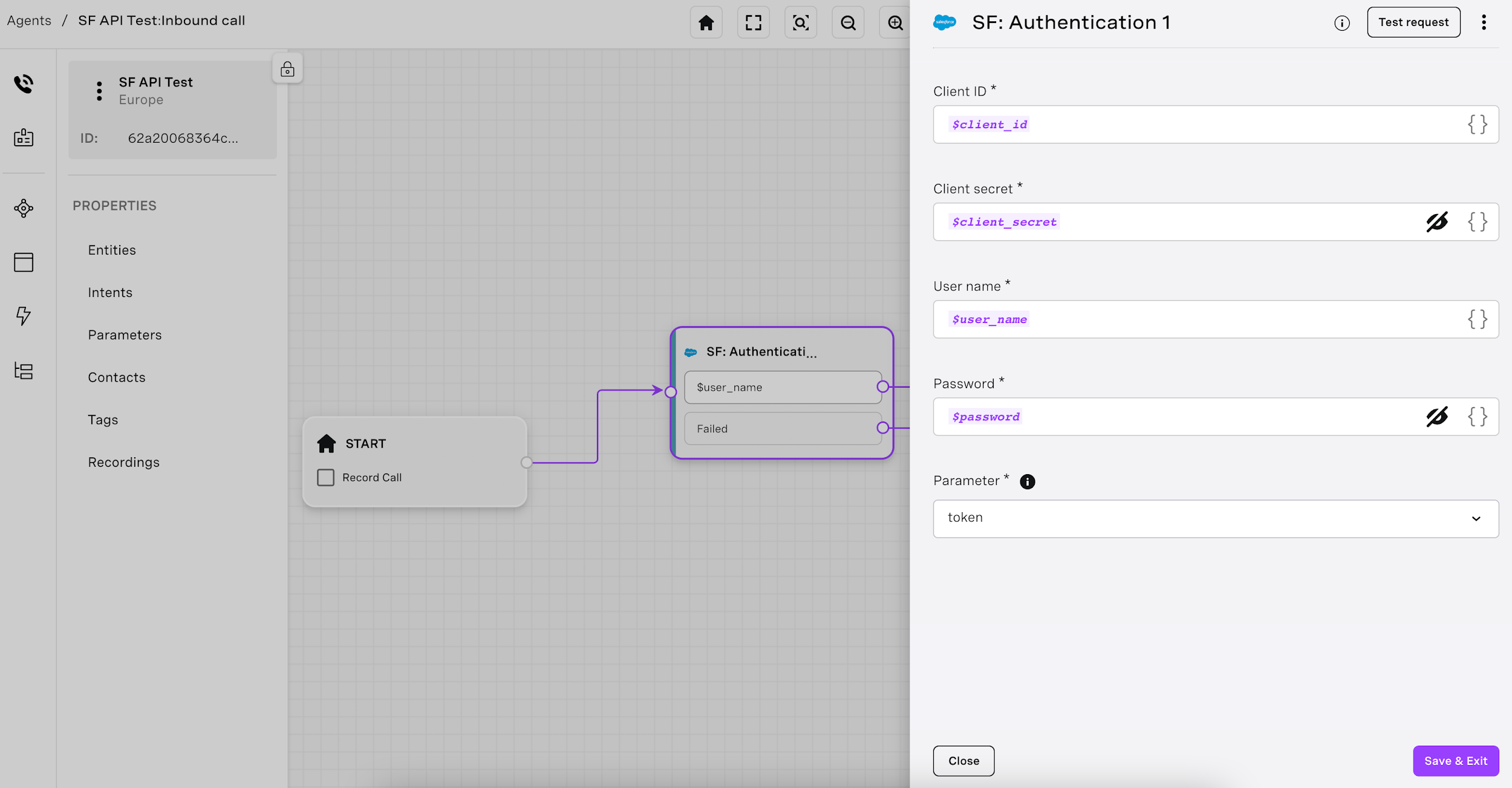 If you want to test your Salesforce Authentication node, you can do so by clicking on "Test Request" on the top right of the node.